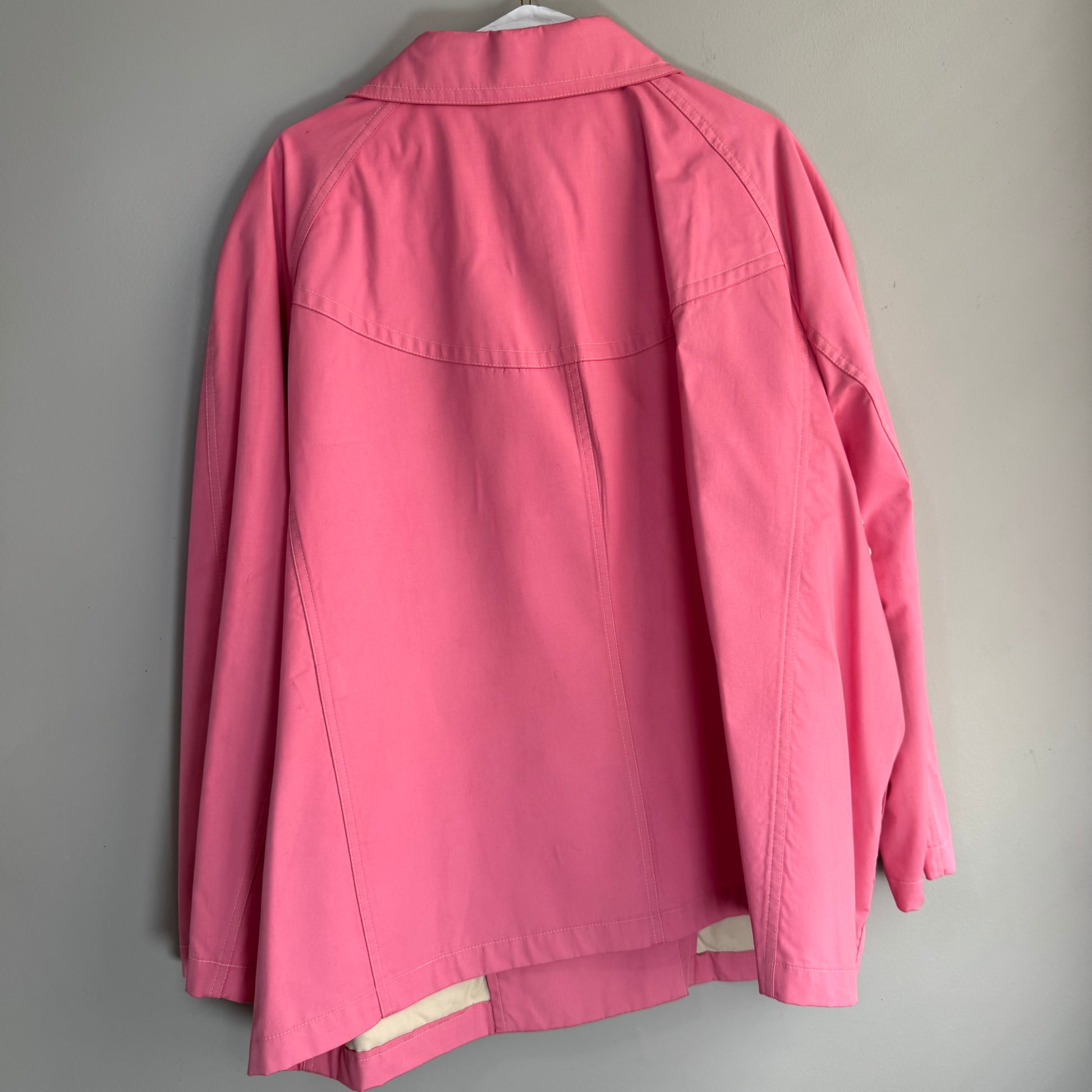 "A" shaped pink raincoat, collar, hidden pink buttons, front pockets, white stitching