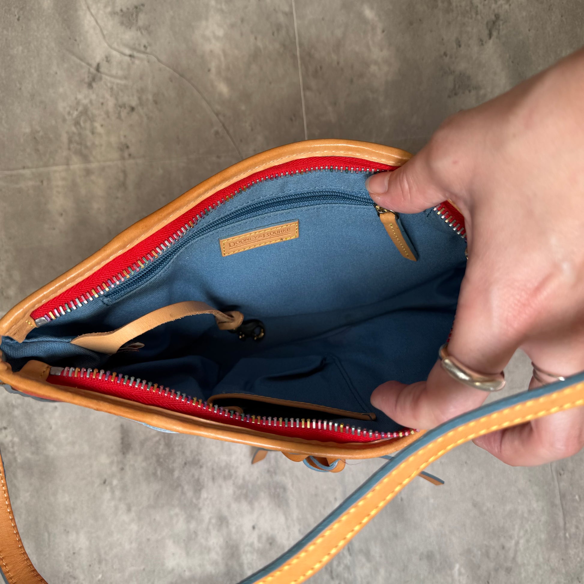 This playful-yet-polished Dooney & Bourke shoulder bag features a vibrant pink coated canvas exterior covered in the brand’s iconic multicolor DB monogram print. Tan leather trim, a lace-up grommet detail, and a heart-shaped leather logo charm bring a dose of early-2000s charm to this Y2K classic. Inside, a zip closure opens to a structured interior with a zip and slip pocket for all your grab-and-go essentials. The shoulder strap makes it an easy everyday statement piece.