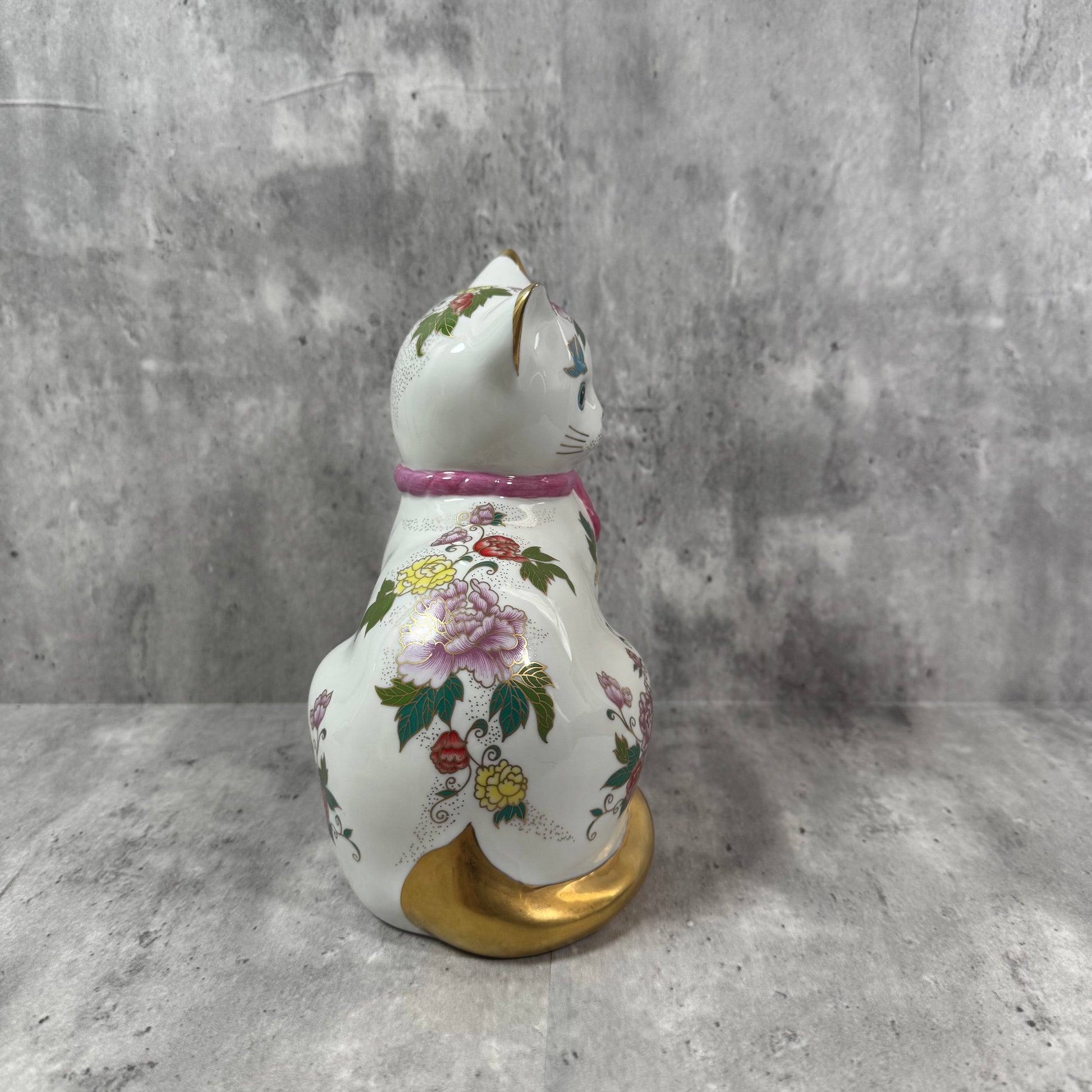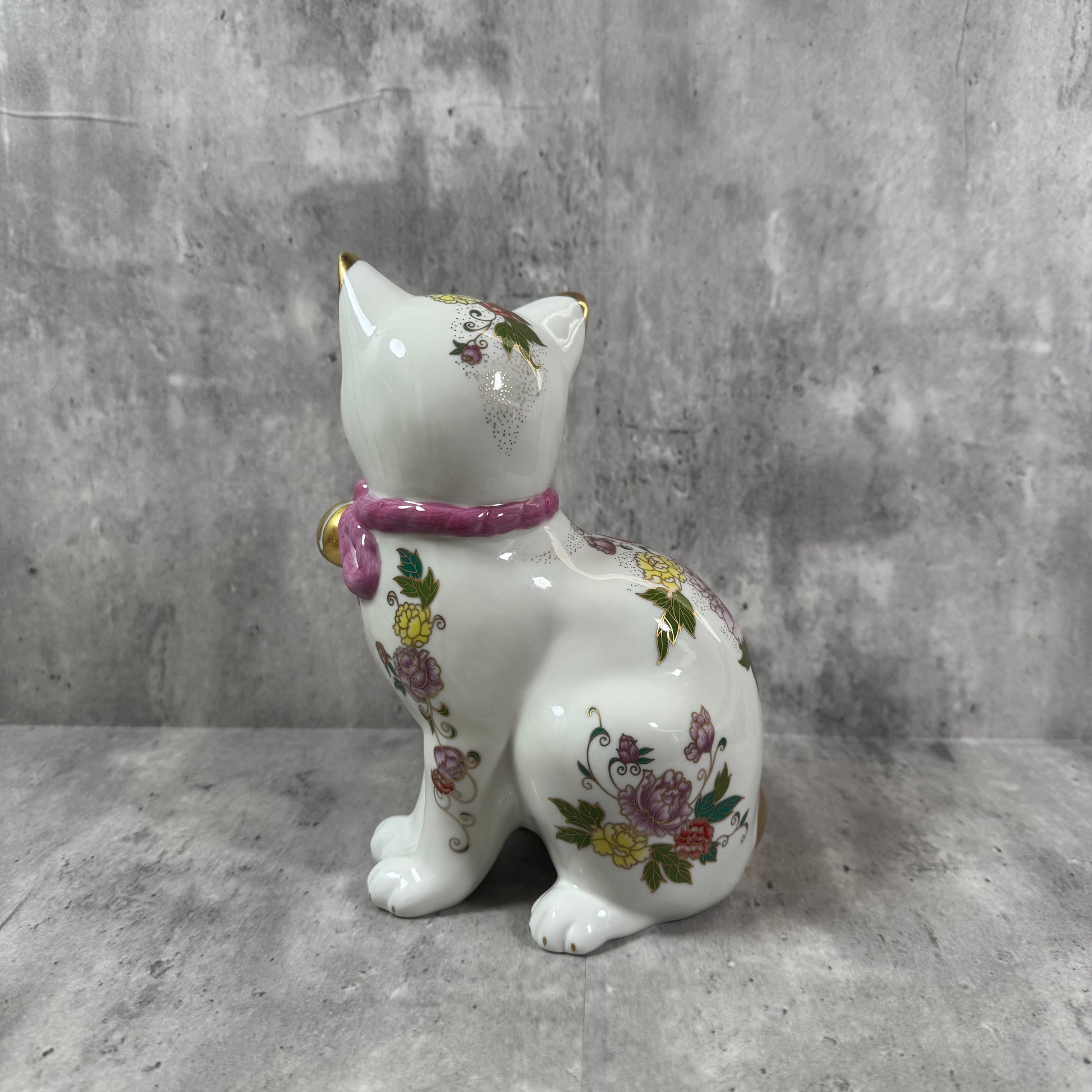 Graceful and auspicious, the Royal Kitten of Prosperity is a 1988 hand-painted porcelain collectible by the Franklin Mint, designed by Japanese artist Yuki Morioka. Crafted in Japan and embellished with 24K gold, this regal white kitten sits serenely adorned with a pink ribbon and golden bell, surrounded by vibrant floral motifs and delicate bluebirds—each detail symbolizing good fortune and abundance.