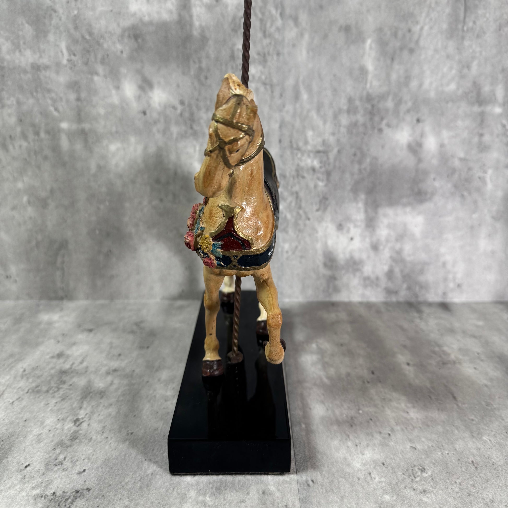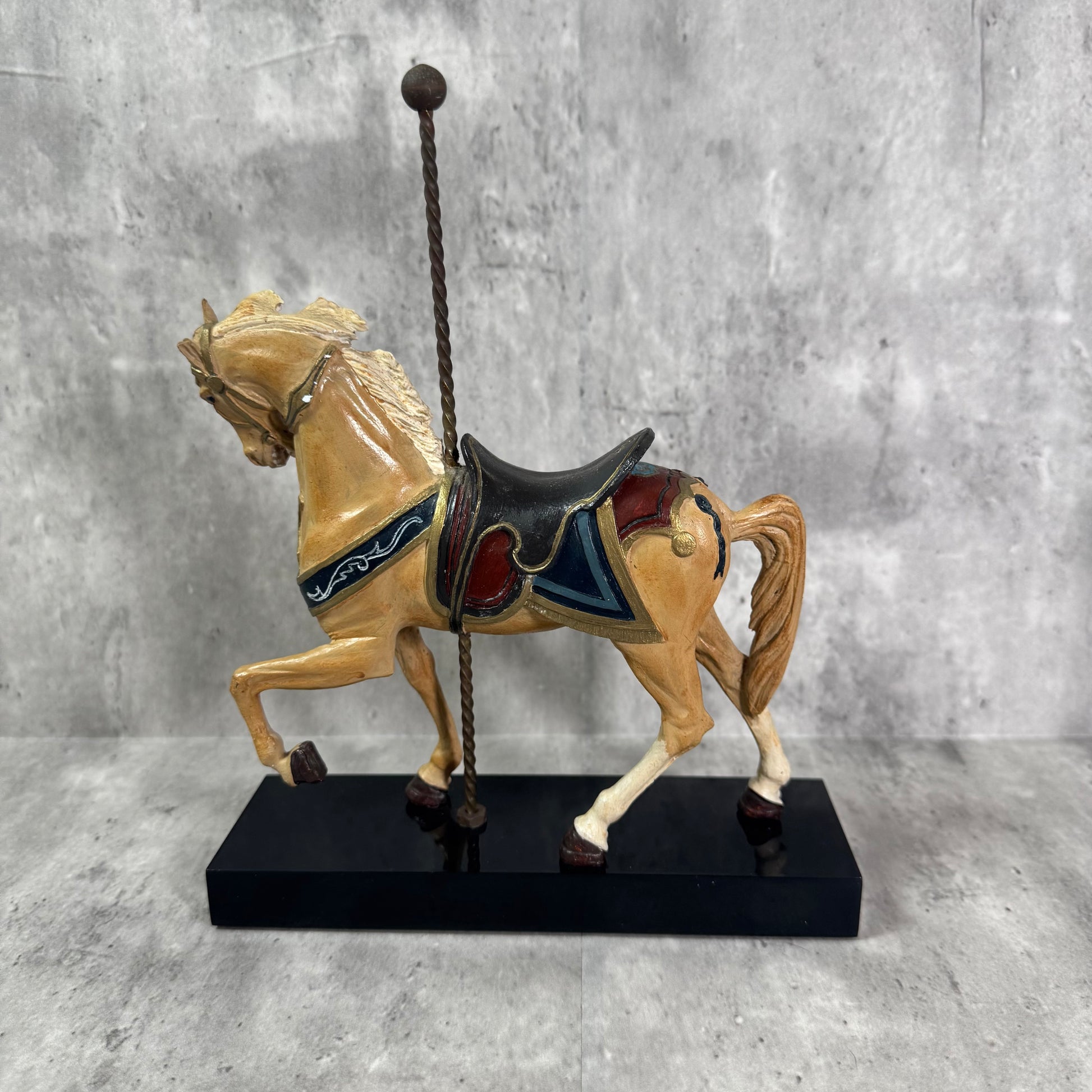 Majestic and full of vintage nostalgia, The Lead Horse is the very first figure in the Art of the Carousel series by the Hamilton Collection. Hand-painted with ornate detail, this 1980s figurine features a proud, rearing carousel horse adorned in vibrant carnival colors and traditional trimmings—evoking the grandeur of turn-of-the-century merry-go-rounds.