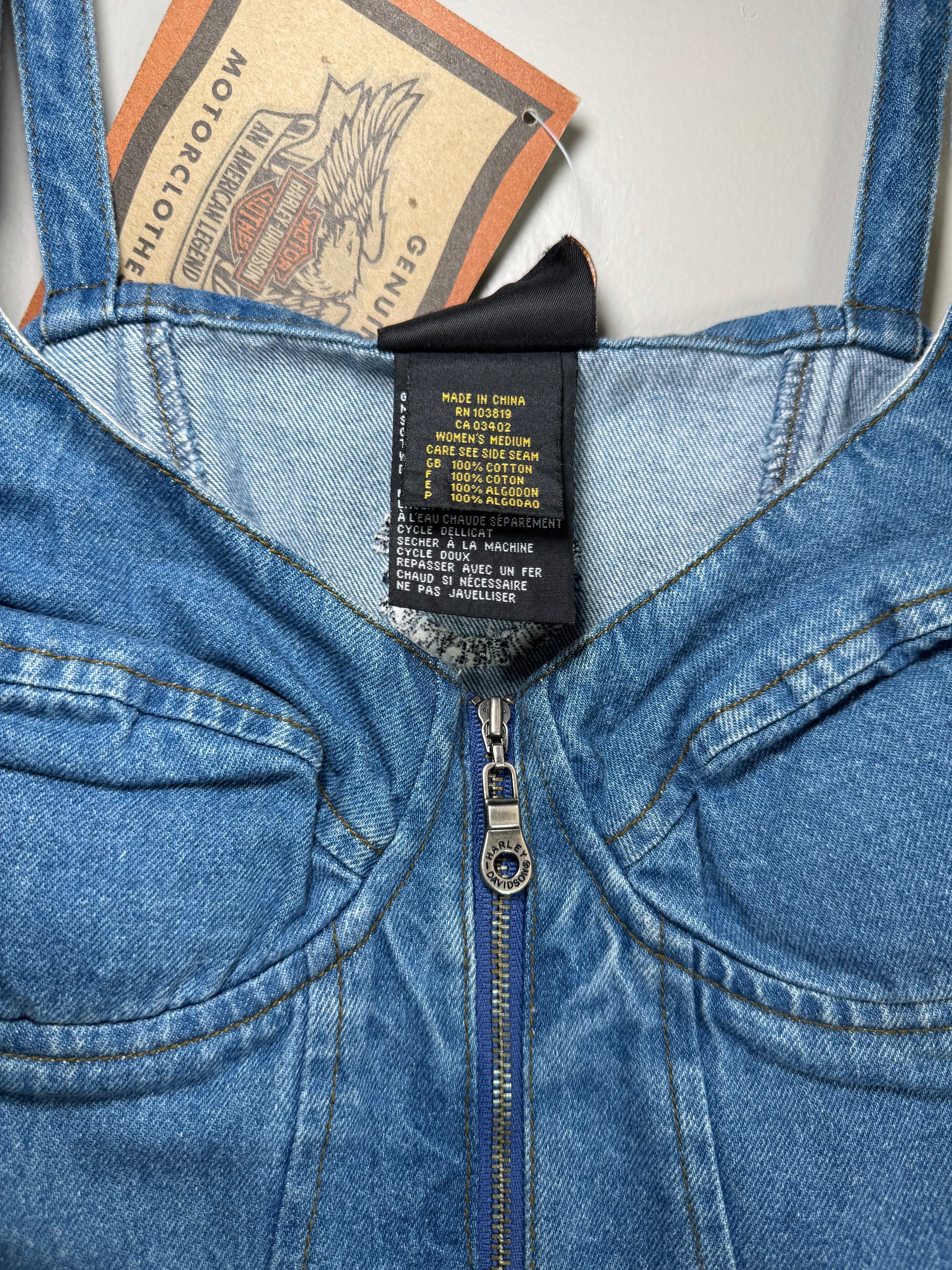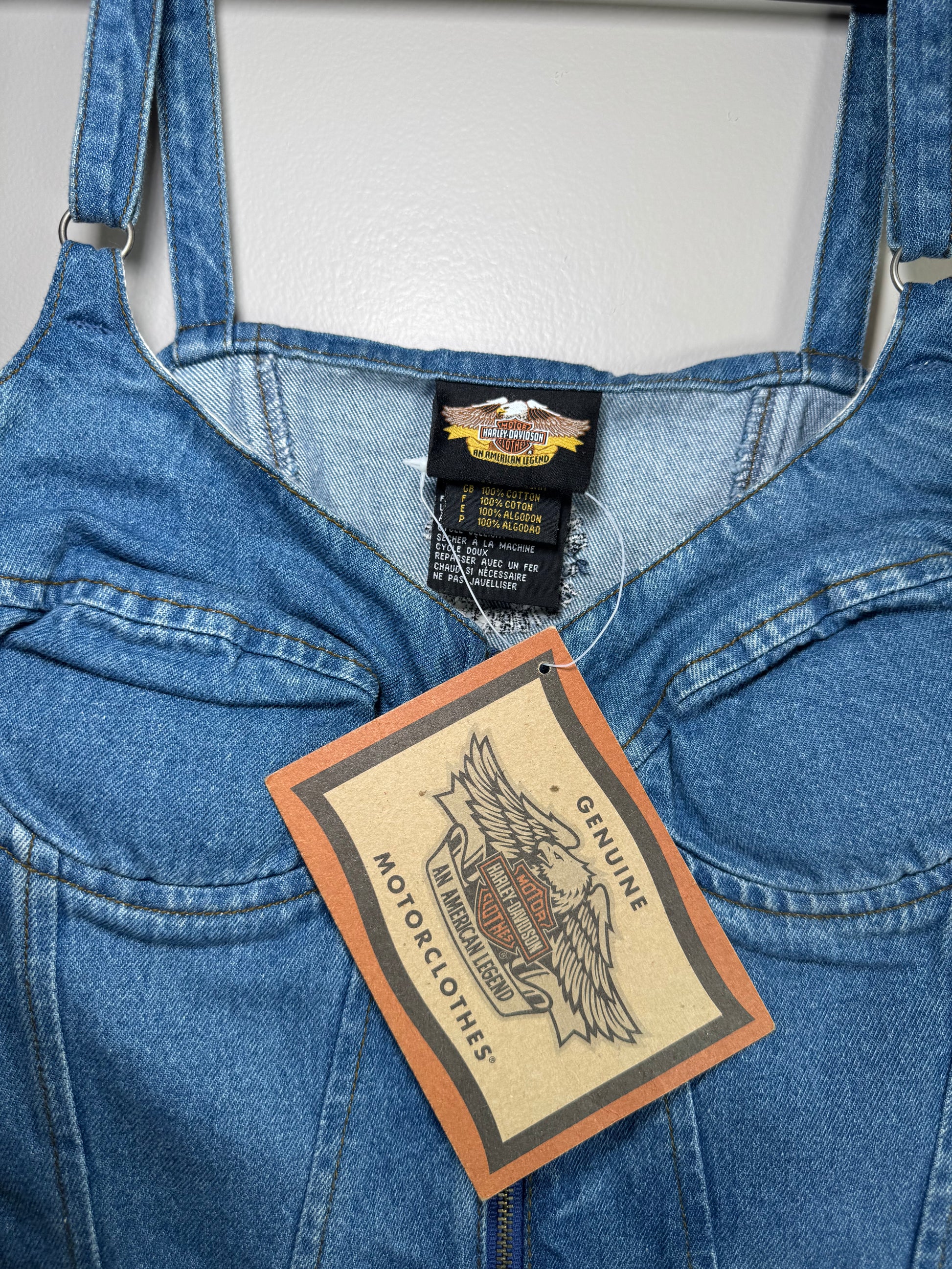 Harley-Davidson’s MotorClothes line, launched to outfit the off-bike lifestyle, brought their road-tested ethos to fashion with gear that blends durability, edge, and Americana. This early 2000s top is a rare example of the brand’s foray into denim corsetry, and it still carries its original tag.