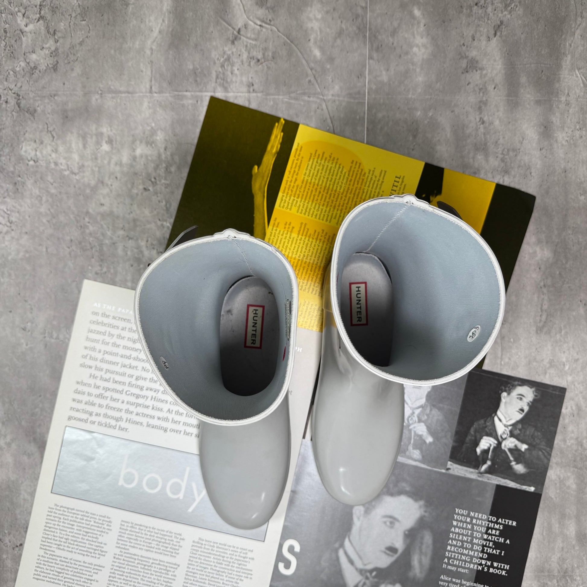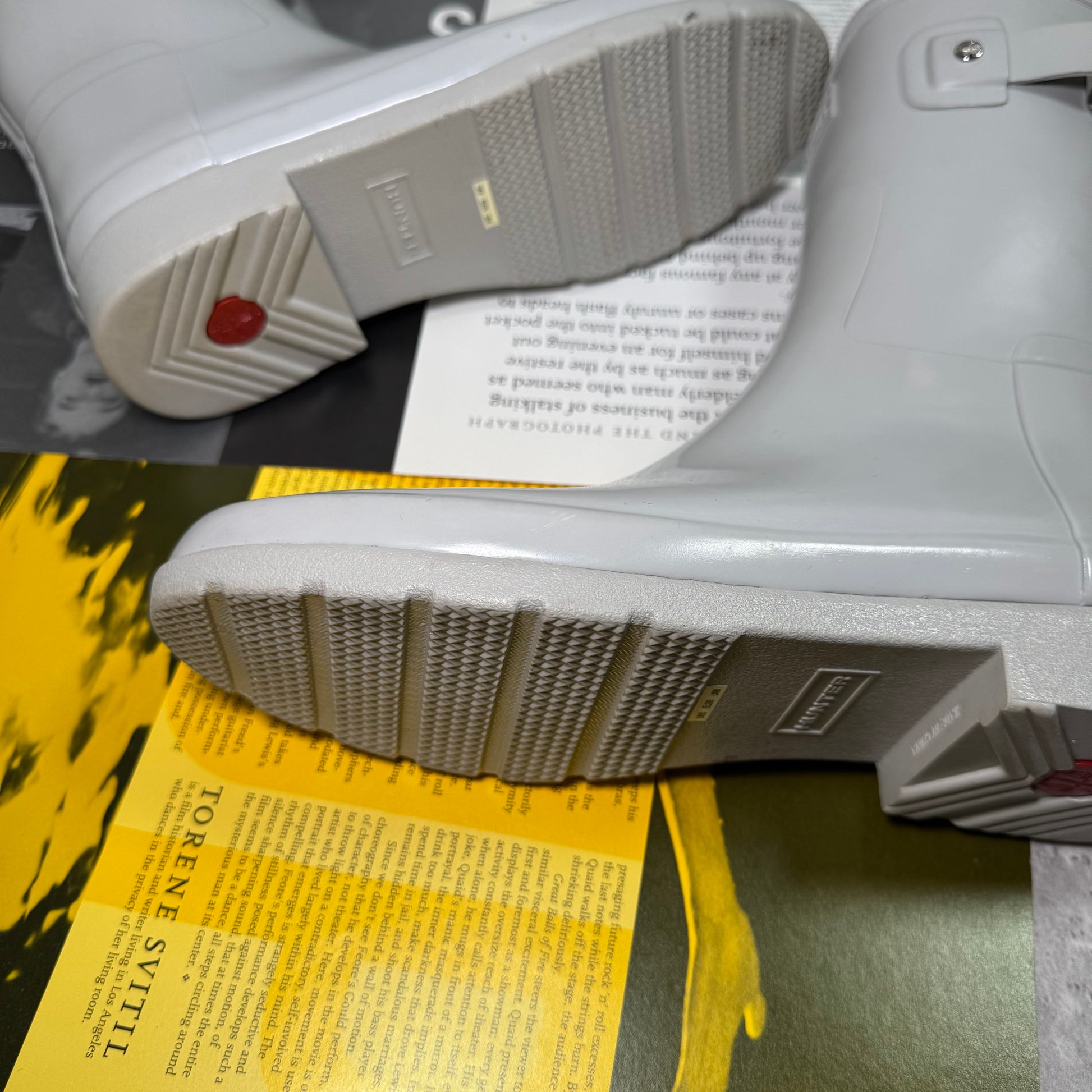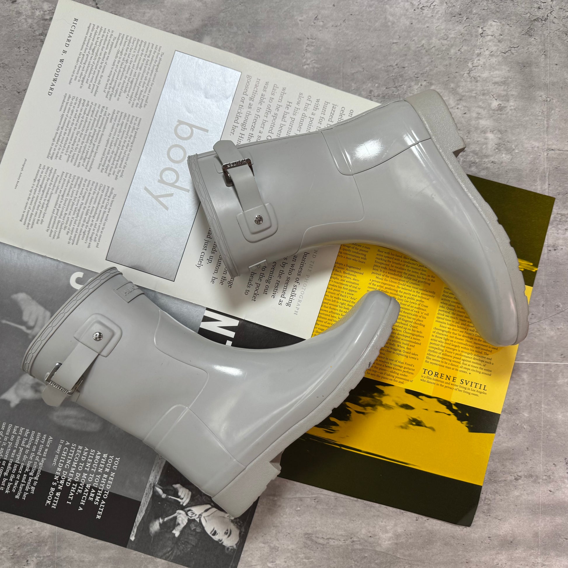 A little drizzle never stopped a style icon. These classic Hunter rainboots in a sleek, soft gray are your new go-to for puddle-hopping in the city or adding a utilitarian edge to your weekend look. With an adjustable side buckle, sturdy non-slip sole, and that signature Hunter logo peeking out from the top, these are as practical as they are polished. The short silhouette makes them easy to slip on and off—ideal for transitional weather or a quick dash to the bodega in style.