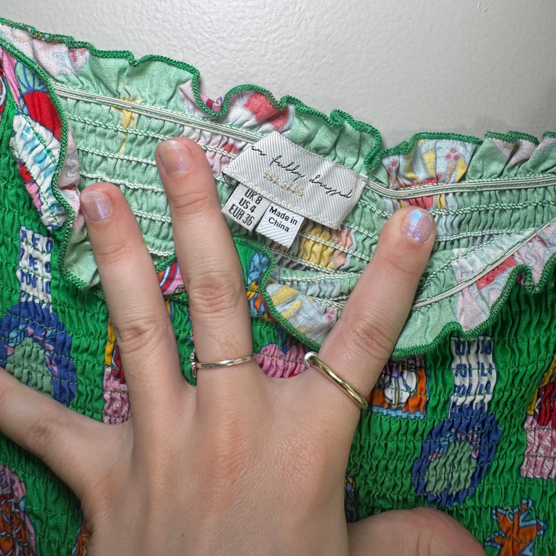 Playful, punchy, and primed for compliments—this Never Fully Dressed maxi is summer-on-a-hanger. With its square neckline, stretchy smocked bodice, and floaty long sleeves, it brings breezy drama in a saturated green palette covered in a cheeky allover fruit label print (yes, that’s a pineapple with a passport). The fabric is light and swishy, making it perfect for warm weather escapades or just pretending you’re on a tropical island while running errands.