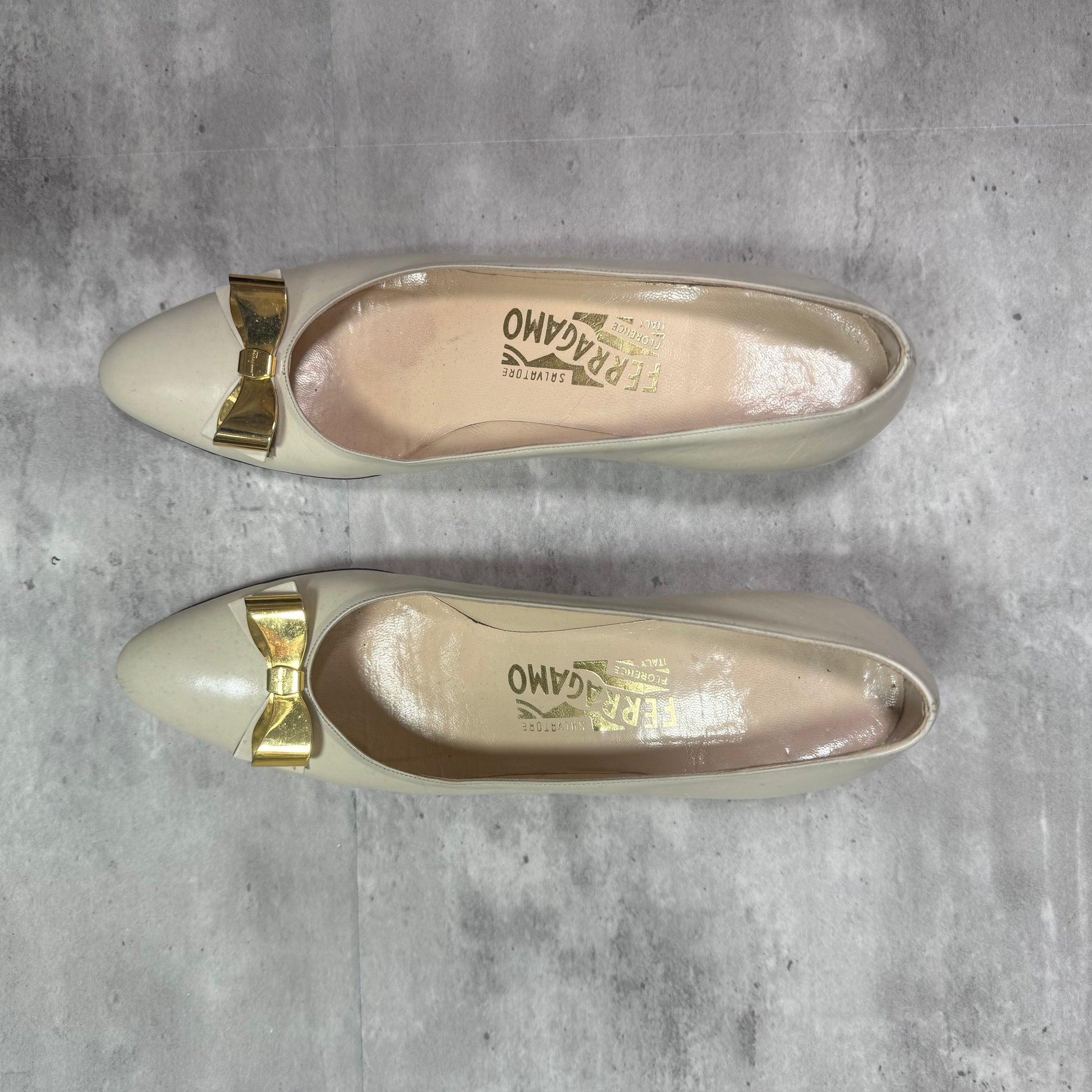 Salvatore Ferragamo Classic White Leather Pumps – Gold Bow Detail, Made in Italy, Size 8.5 AAAA (Narrow)