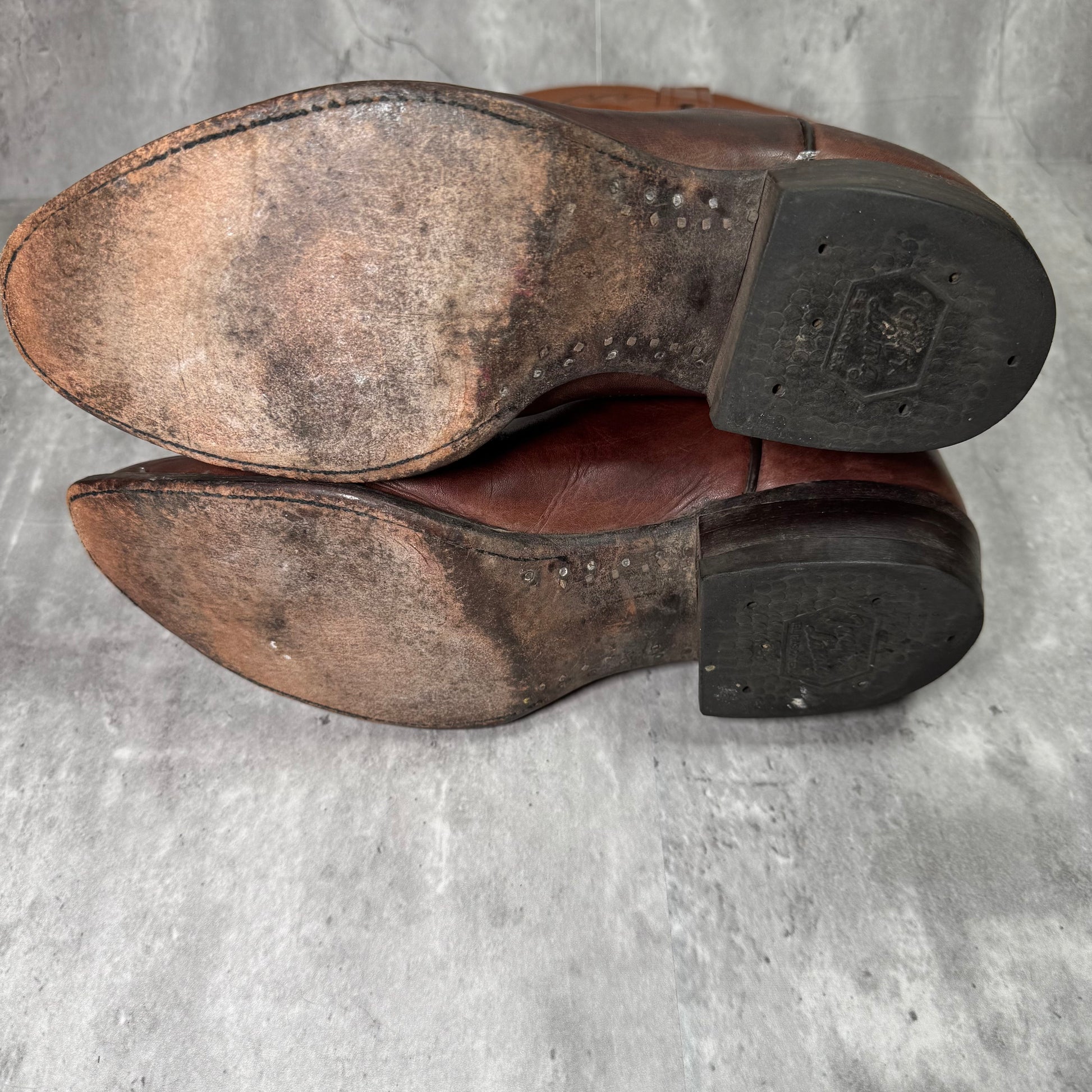Condition: Well-worn vintage condition; visible wear on toe and heel, no damage to stitching or soles