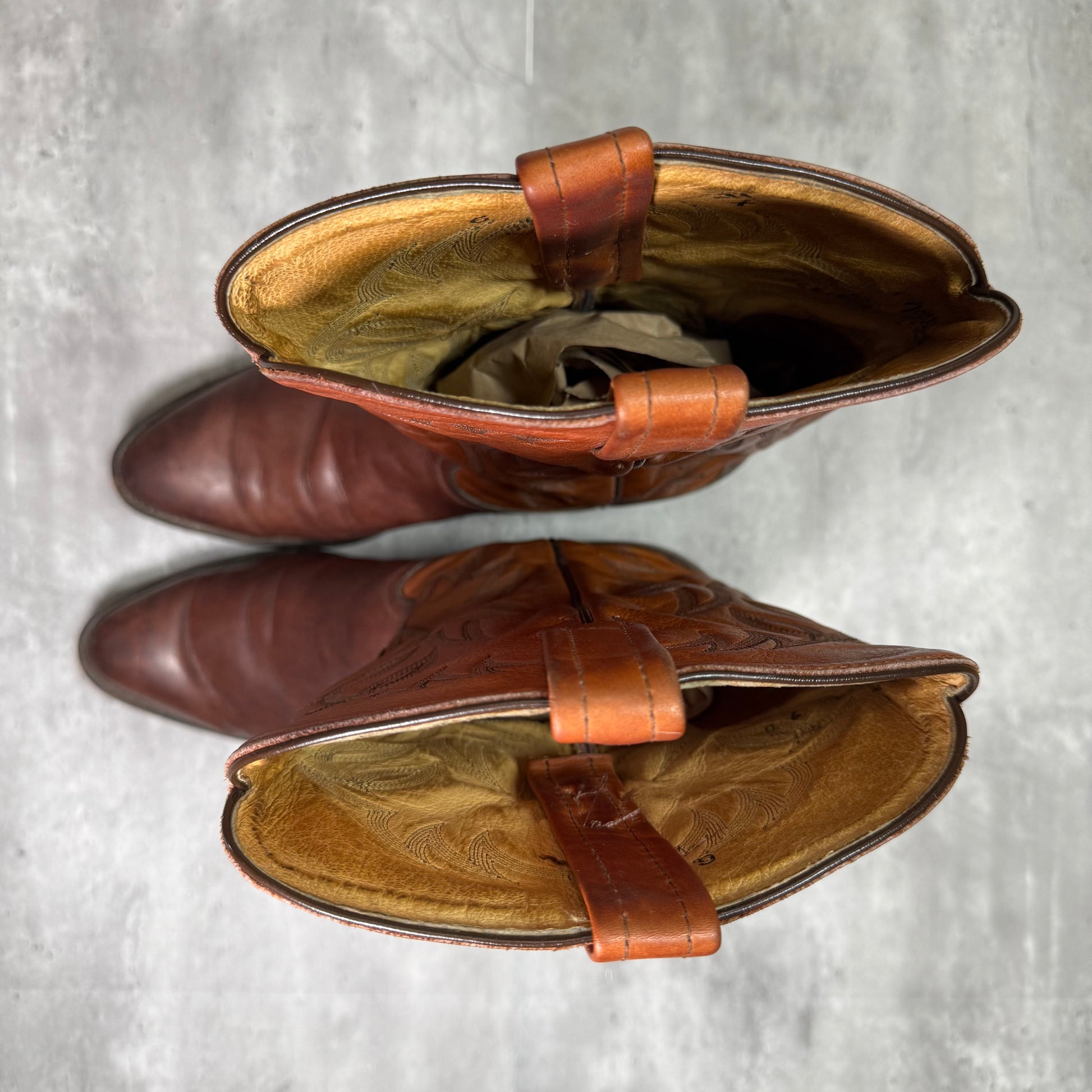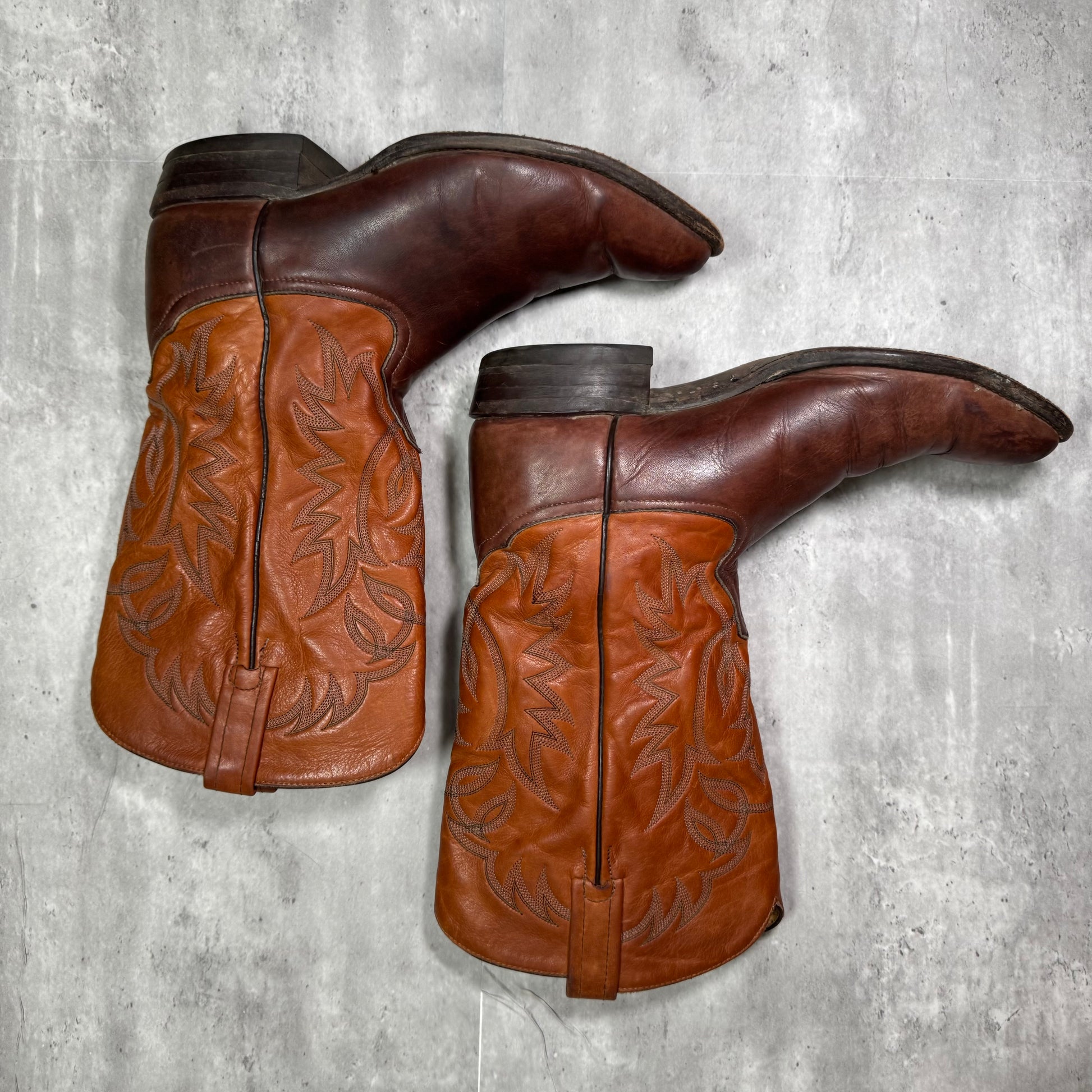 These Tony Lama cowboy boots are everything we love about a well-worn classic: tough, stylish, and full of story. Crafted from two-tone leather—deep brown on the foot, warm rust on the shaft—with bold Western embroidery, they’re made to be seen and lived in.
