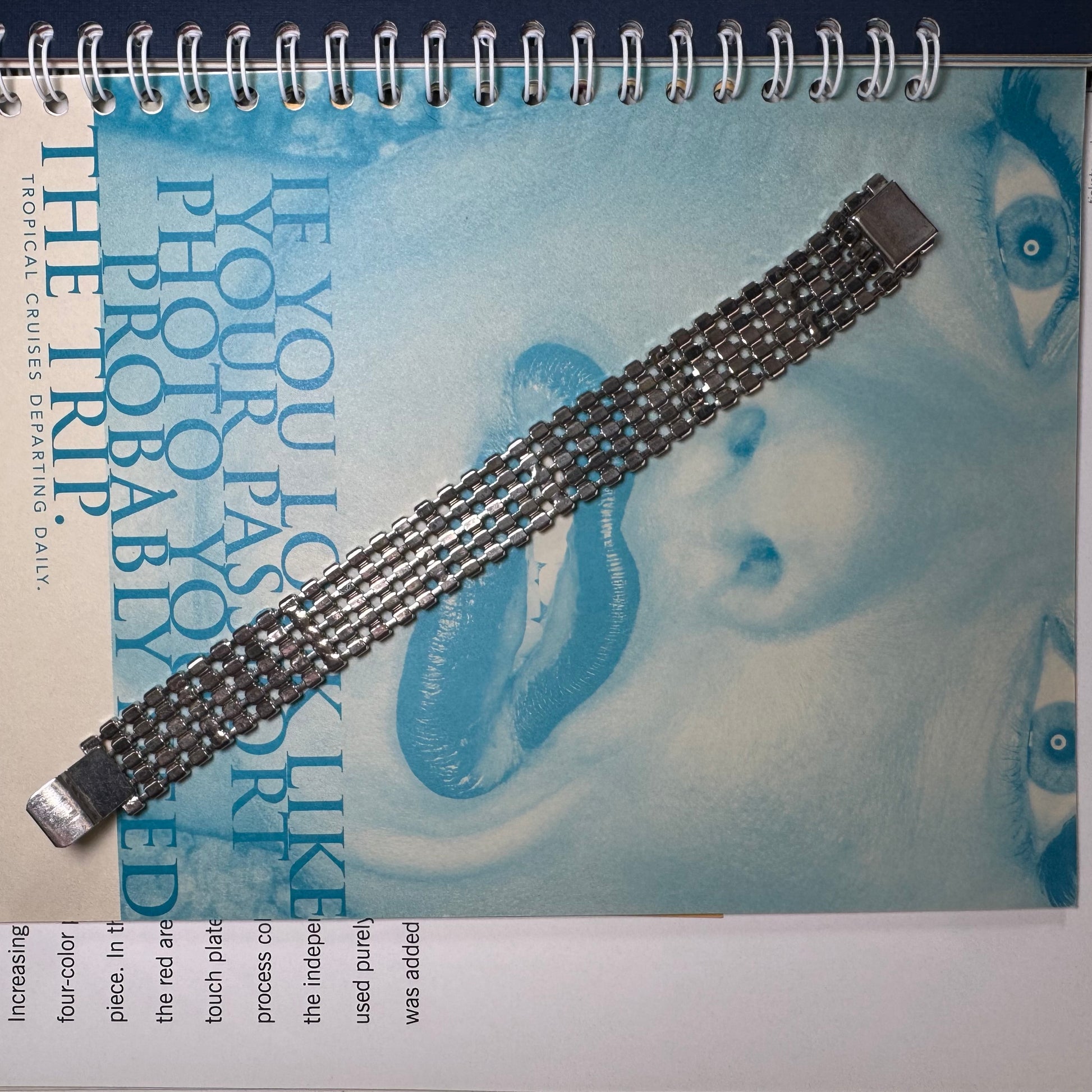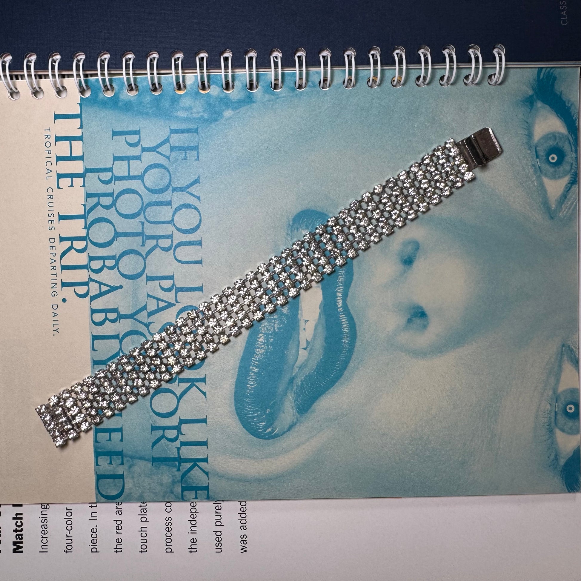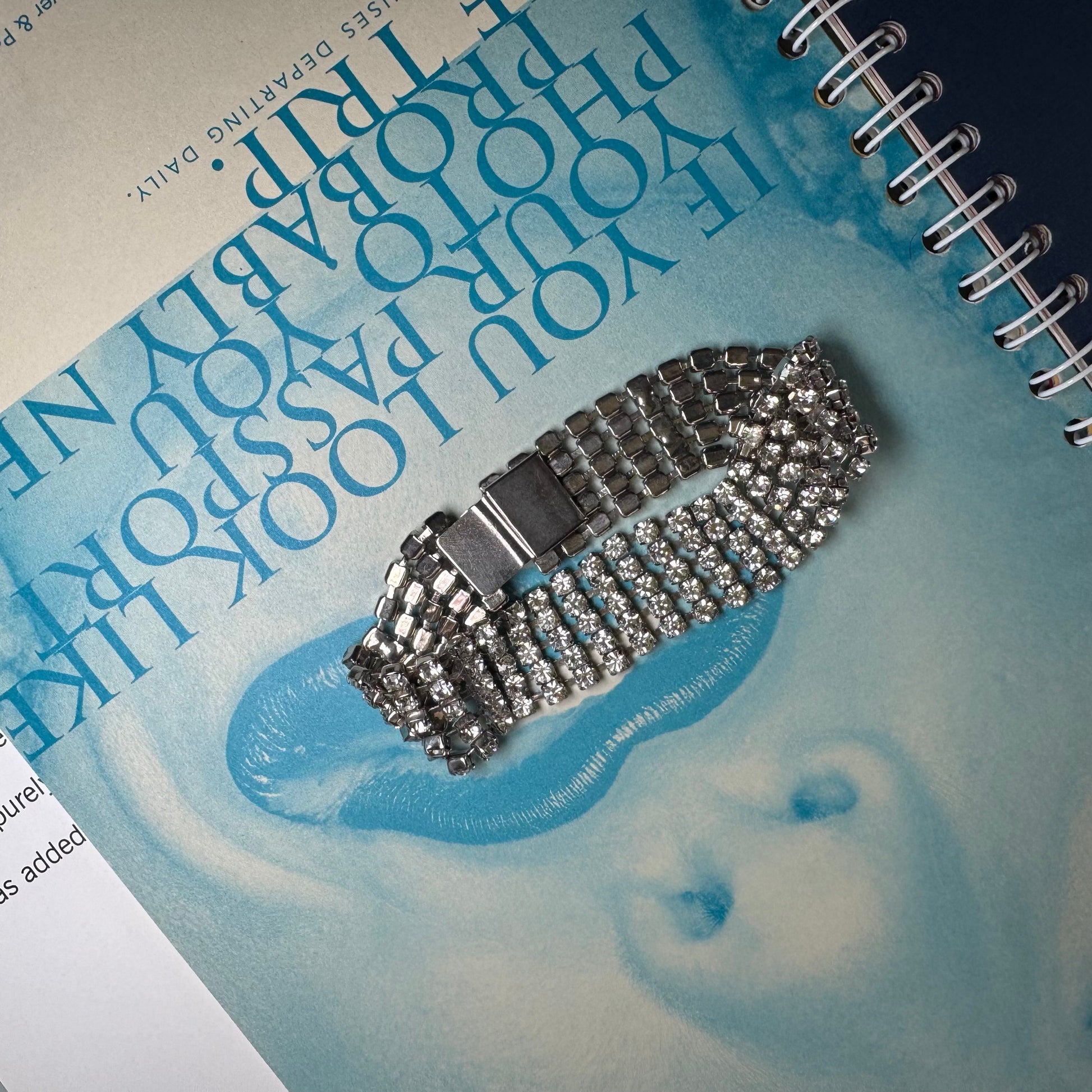 Indulge in the timeless beauty and sophistication of our 1950 style vintage Rhinestone Hidden Slide Clasp Bracelet, measuring 7 inches when unclasped and featuring a width of 5/8 inch. The dazzling stones, with a diameter of 2.8mm, add a touch of luxury to this exquisite piece.